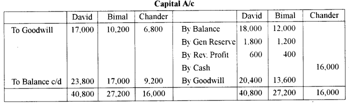 They admitted Chander as a new partner on 1.4.2010 and the new profit sharing ratio became 5:3:2. Chander introduced a capital of Rs. 16.000. Chander w as unable to bring any cash for good will and so it was decided to value the goodwill on the basis of his share in the profits and the capital contributed by him. The following revaluations were made at the time of Chander s admission :