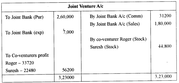 Roger and Suresh sharing profits and losses in the ratio of 3 : 2 jointly agreed to underwrite the subscription of 60,000 equity shares of Rs. 10 each of Parag and Company Limited at a premium of Rs. 3 per share. The underwriting commission is 4% as provided in the Articles. Applications were received from the public only for 40,000 shares and so the underwriters took over the remaining shares. A joint bank account was opened towards which Roger contributed Rs. 55.000 and Suresh Rs. 45,000. A sum of Rs. 7.000 was incurred on various expenses which were paid out of the joint bank account. Parag and Company paid the underwriting commission by cheque. At the close of the venture, the underwriters sold 12.000 shares at the rate of Rs. 15 per share and the rest of the shares were taken up by them at the rate of Rs. 14 per share, in their profit and loss sharing ratio.