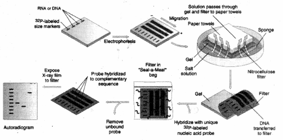 (b) Principle of Southern blotting: In this technique, DNA is usually converted into conveniently sized fragments by restriction digestion. The fragments are then separated by migration through an agarose gel, and transferred to a nylon or nitrocellulose membrane by capillary action. The DNA of interest can be identified by hybridization to radioactive or chemiluminescent probes and visualized by autoradiography or staining.
