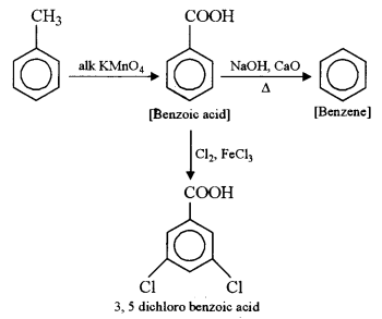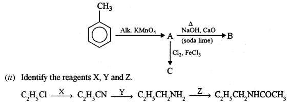 (b) (i) A → Benzoic acid, B → Benzene, C → 3, 5 dichloro benzoic acid.