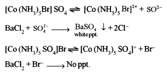 The aqueous solution of [Co(NH3)5 Br] SO4 will give a white ppt. with BaCl2 solution insoluble in conc. HNO3, confirming the presence of free \(\mathrm{SO}_{4}^{2-}\) ion. An aqueous solution of [Co(NH3)5SO4] Br will not give this test.