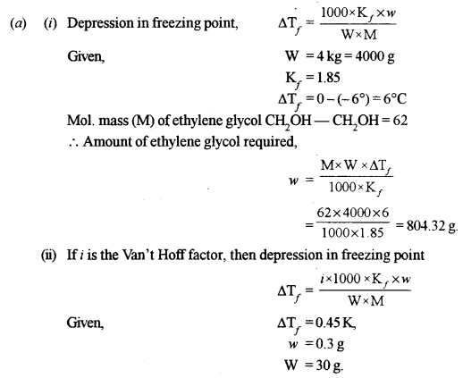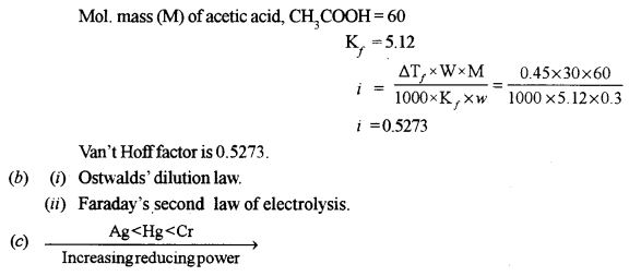 (ii) The freezing point of a solution containing 0.3 g of acetic acid in 30 g of benzene is lowered by 0.45 K. Calculate the Van’t Hoff factor.