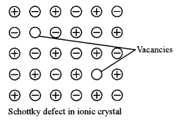(b) (i) Schottky defect: It is a stoichiometric defect in which the equal number of cations and anions in the ionic crystal are missing from their lattice sites and electrical neutrality is maintained.