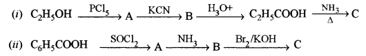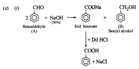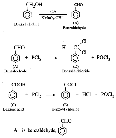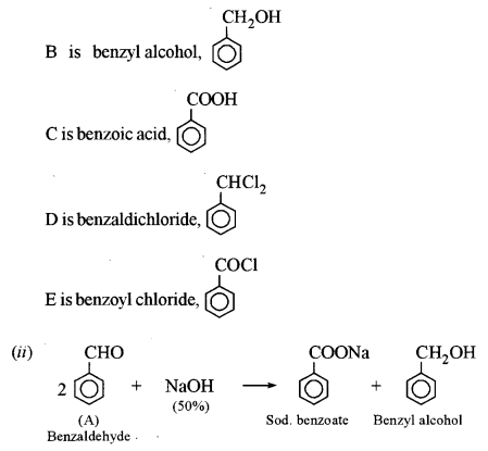 (a) An organic compound A has the molecular formula C7H6O. When A is treated with NaOH followed by acid hydrolysis, it gives two products B and C. When B is oxidized, it gives A when A and C are each treated separately with PCl5, they give two different products D and E. [3]