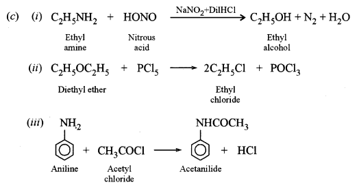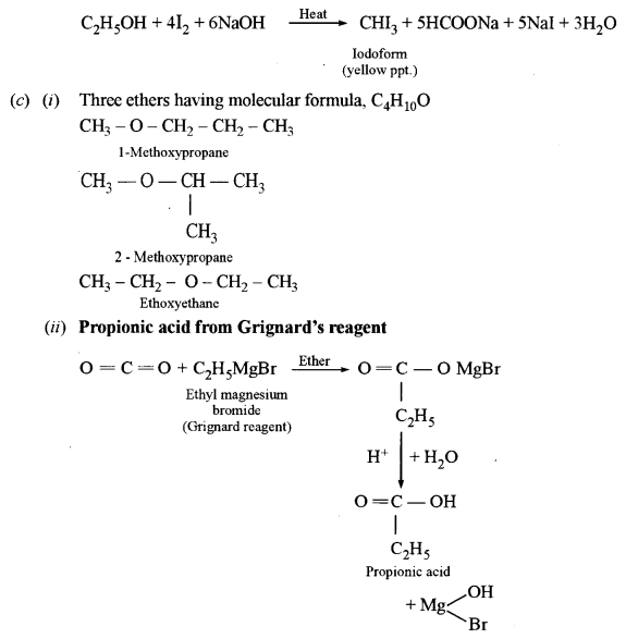 (ii) Dimethyl ether and ethyl alcohol: C2H5OH, when heated with I2and NaOH, gives yellow precipitate crystals of iodoform (Iodoform test) whereas diethyl ether does not give a yellow precipitate with I2 and NaOH.