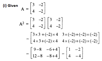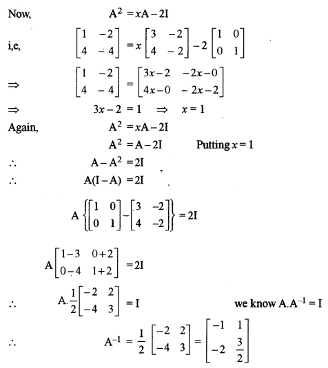 (i) If \(A=\left[\begin{array}{ll}{3} & {-2} \\ {4} & {-2}\end{array}\right]\), find x such that A2 = xA – 2I. Hence find A-1. [3]