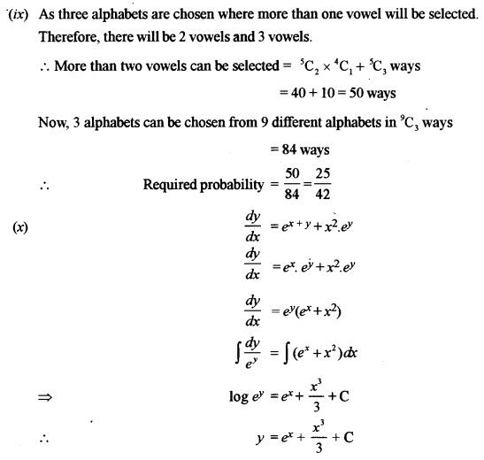 (ix) A word consists of 9 different alphabets, in which there are 4 consonants and 5 vowels. Three alphabets are chosen at random. What is the probability that more than one vowel will be selected? [3]