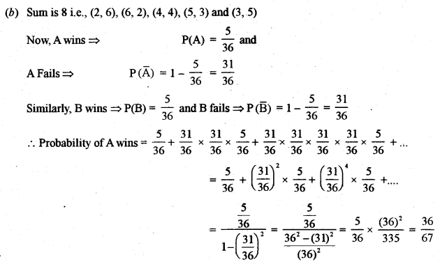 (b) Aman arid Bhuvan throws a pair of dice alternately. In order to win, they have to get a sum of 8. Find their respective probabilities of winning if Aman starts the game. [5]