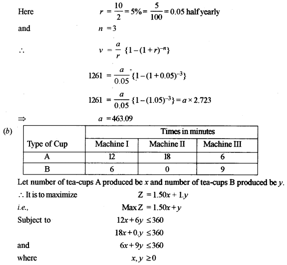 (a) The price of a tape recorder is ₹ 1,661. A person purchases it by making a cash payment of ₹ 400 and agrees to pay the balance with due interest in 3 half-yearly equal instalments. If the dealer charged interest at the rate of 10% per annum compounded half-yearly, find the value of the instalment. [5]