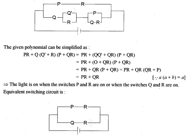 (b) P, Q and R represent switches in on position and P’, Q’ and R’ represent switches in off position. Construct a switching circuit representing the polynomial PR + Q (Q’ + R) (P + QR). Using Boolean Algebra, simplify the polynomial expression and construct the simplified circuit. [5]