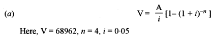 (a) A person borrows ₹ 68962 on the condition that he will repay the money with compound interest at 5% per annum in 4 equal annual instalments, the first one being payable at the end of the first year. Find the value of each instalment. [5]
