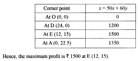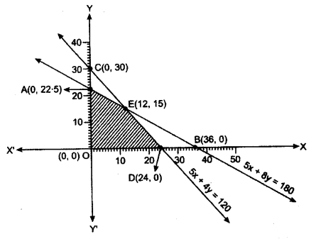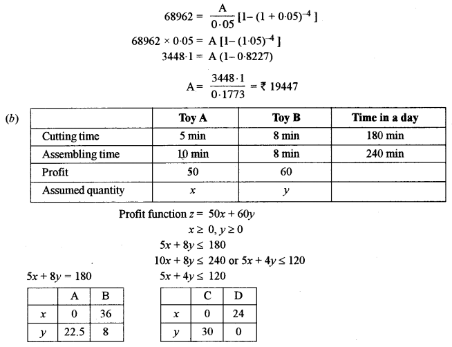(b) A company manufactures two types of toys A and B. A toy of type A requires 5 minutes for cutting and 10 minutes for assembling. A toy of type B requires 8 minutes for cutting and 8 minutes for assembling. There are 3 hours available for cutting and 4 hours available for assembling the toys in a day. The profit is ₹ 50 each on a toy of type A and ₹ 60 each on a toy of type B. How many toys of each type should the company manufacture in a day to maximize the profit? Use linear programming to find the solution. [5]