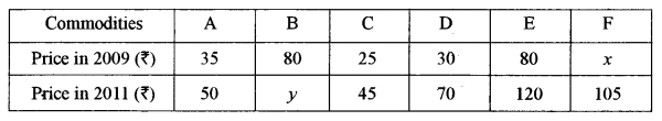 The Index number for the year 2011 taking 2009 as the base year for the above data was calculated to be 125. Find the values of x andy if the total price in 2009 is ₹ 360.