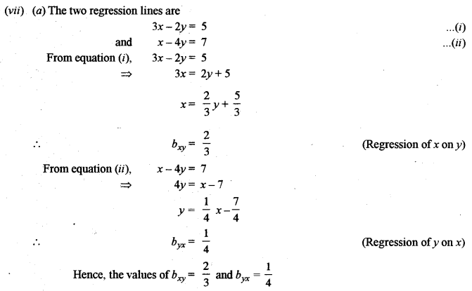 (vii) For the given lines of regression, 3x – 2y = 5 and x – 4y = 7, find: