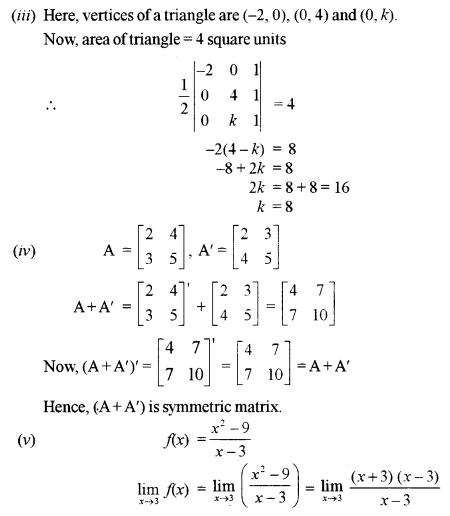 (iii) Using determinants, find the values of k, if the area of triangle with vertices (-2, 0), (0, 4) and (0, k) is 4 square units.