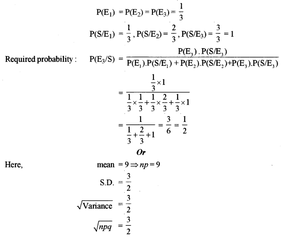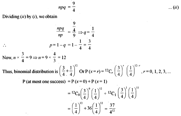(b) Determine the binomial distribution where mean is 9 and standard deviation is \(\frac { 3 }{ 2 }\). Also, find the probability of obtaining at most one success.