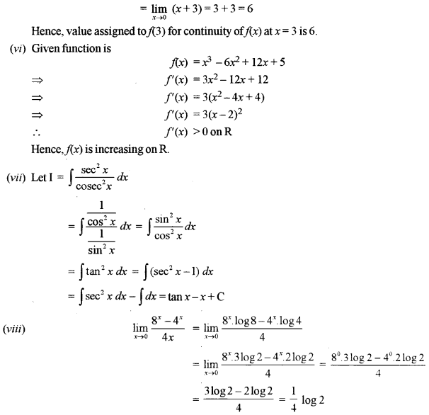 (v) f(x) = \(\frac { { x }^{ 2 }-9 }{ x-3 }\) is not defined at x = 3. What value should be assigned to f(3) for continuity of f(x) at x = 3?