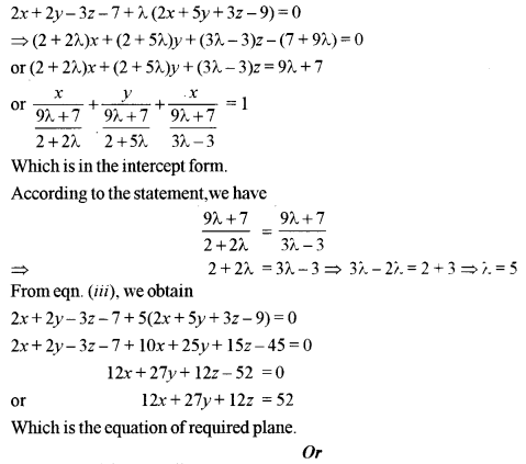 (a) Find the equation of the plane passing through the intersection of the planes 2x + 2y – 3z – 7 = 0 and 2x + 5y + 3z – 9 = 0 such that the intercepts made by the resulting plane on the x – axis and the z – axis are equal.