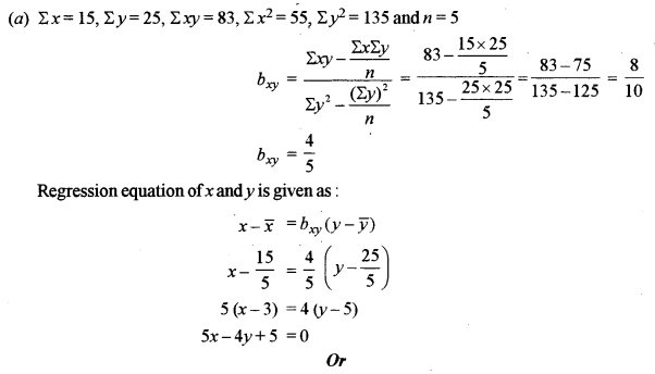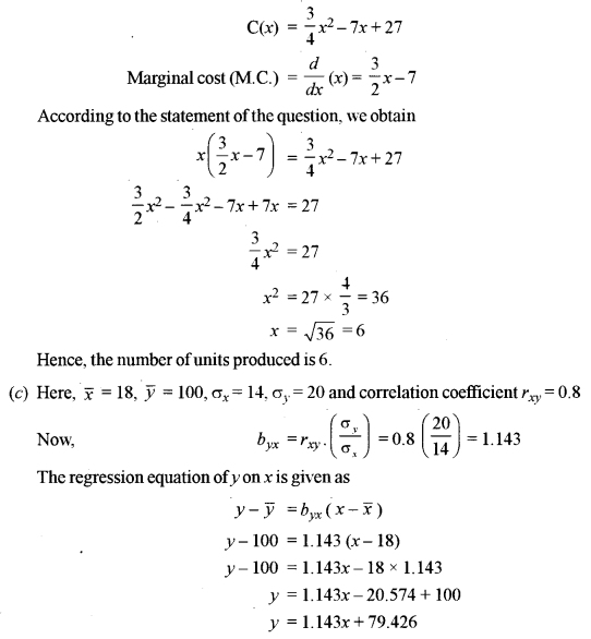 (c) If \(\vec { x }\) = 18, \(\vec { x }\) = 100, σx = 14, σy = 20 and correlation coefficient rxy = 0.8, find the reggression equation of y on x.