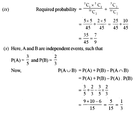 (x) If events A and B are independent, such that P( A) = \(\frac { 3 }{ 5 }\), P (B) = \(\frac { 2 }{ 3 }\), find P(A∪B).