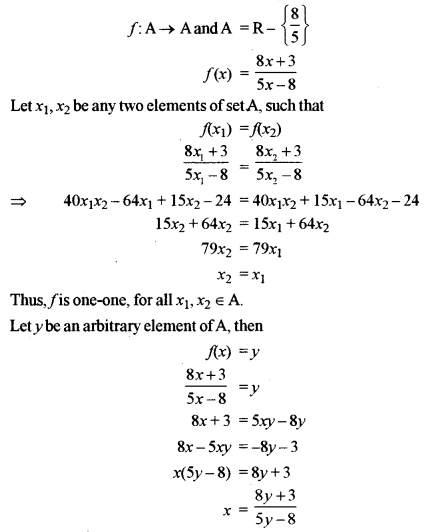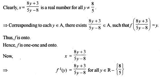If f: A → A and A = R – {\(\frac { 8 }{ 5 }\)}, show that the function f(x) = \(\frac { 8x+3 }{ 5x-8 }\) is one-one onto. Hence, find f-1.