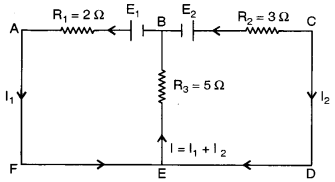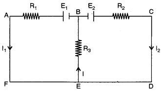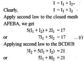 (a) In the circuit shown in figure, E1 = 17 V, E2 = 21V, R1 = 2 Ω, R2 = 3 Ω and R3 = 5 Ω. Using Kirchhoff’s laws,find the currents flowing through the resistors R1, R2 and R3. (Internal resistance of each of the batteries is negligible). [4]