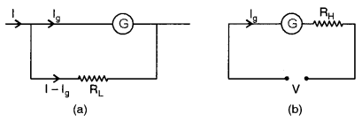 (b) A galvanometer is connected into an ammeter by connecting a low resistance of a suitable value in parallel with the galvanometer and into a voltmeter by connecting a high resistance in series with galvanometer as shown in fig. (a) and (b) respectively.
