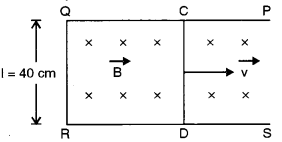 (b) A metallic rod CD rests on a thick metallic wire PQRS with arms PQ and RS parallel to each other, at a distance l = 40 cm, as shown in figure. A uniform magnetic field B = 0.1 T acts perpendicular to the plane of this paper, pointing inwards (i.e,.. away from the reader). The rod is now made to slide towards right, with a constant velocity of v = 5 0 ms-1. [3]
