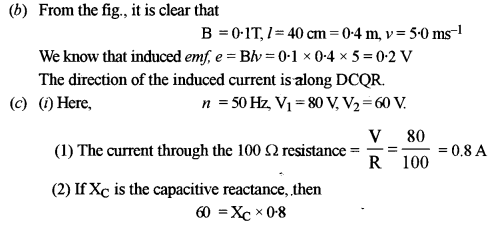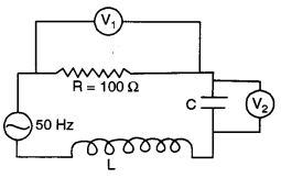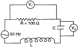 (c) (i) Figur below shows a series RCL circuit connected to an ac source which generates an alternating emf of frequency 50 Hz. The readings of the voltmeters V1 and V2 are 80 V and 60 respectively.