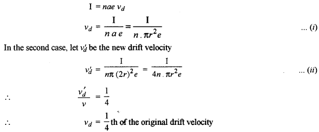 (ii) A current ‘I’ flows through a metallic wire of radius ‘r’ and the free electrons in it drift with a velocity vd. Calculate the drift velocity of the free electrons through the wire of the same material, having double the radius, when same current flows through it.