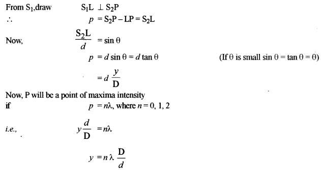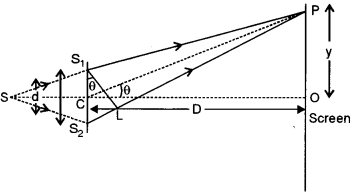 (b) In the fig. are shown two coherent sources S1 and S2 illuminated by the same source S.d is the distance between the two sources. D is the disance between the source and the screen. P is a point on the screen having an angle height θ. O is a point on the screen situated symmetrically w.r.t. two sources. Let OP = Y. Path difference between the disturbances starting from S2 and Si reaching P. is