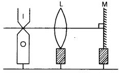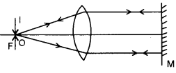 (b) A convex lens ‘L’ and a plane mirror ‘M’ are arranged as shown in figure below. Position of object pin ‘O’ is adjusted in such a way that the inverted image ‘I’ formed by the lens mirror combination, coincides with the object pin ‘O’. Explain how and when this happens. [2]