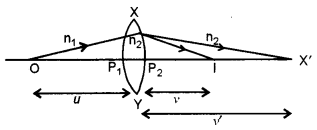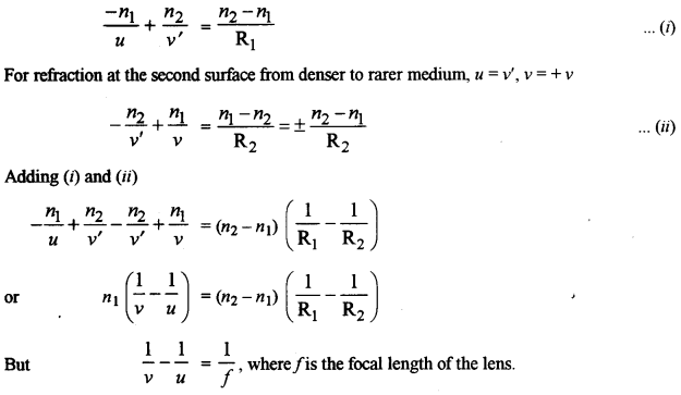 Consider a thin convex lens XY having R1 and R2 as the radii of curvatures of the two surfaces XP1Y and XP2Y respectively. Let n1 be the refractive index of the medium in which the object O is situated and n2 the refractive index of the material of the lens. The first surface of radius of curvature R1 forms the image of the object O at a distance v’ from the surface XP1Y. This image then serves as a virtual object for the second surface giving rise to a final image at I. For refraction at the first surface, we can write
