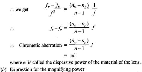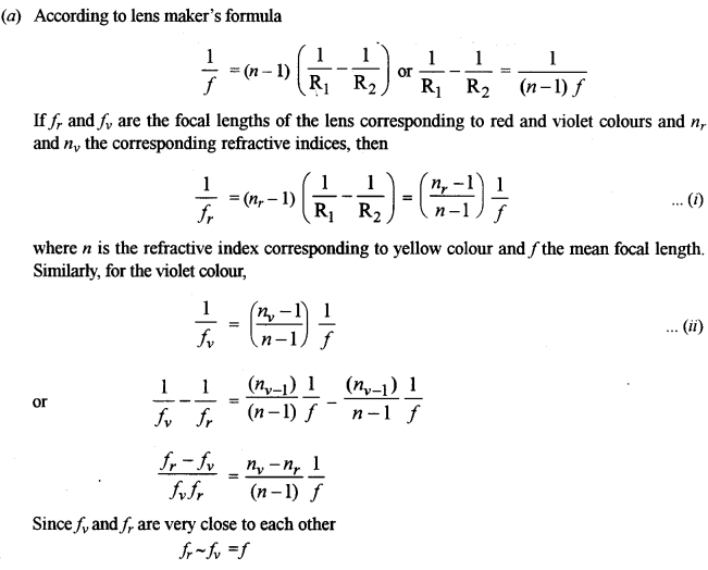 (a) Show that the axial chromatic aberration (fr – fv) for a convex lens is equal to the product of its mean focal length (f) and dispersive power (ω) of its material i.e., Prove : [3]
