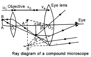 (b) Draw a labelled diagram of an image formed by a compound microscope, with the image at least distance of distinct vision. Write any one expression for its magnifying power. [3]