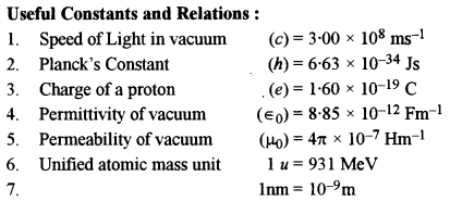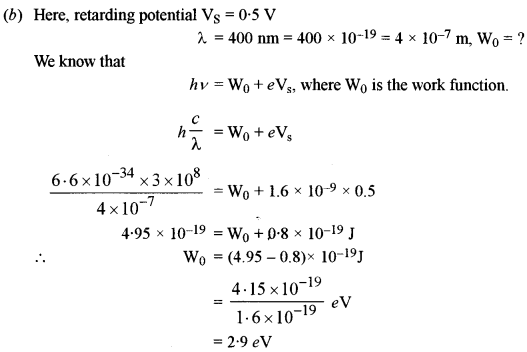 (b) In a photoelectric cell, a retarding potential of 0.5 V is required to block the movement of electrons from the cathode when monochromatic light of wavelength 400 nm is incident on its surface. Find the work function of the material of the cathode. [3]