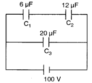 (b) Three capacitors C1 = 6 μF, C2 = 12 μF and C3 = 20 μF are connected to a 100 V battery, as shown in figure alongside: