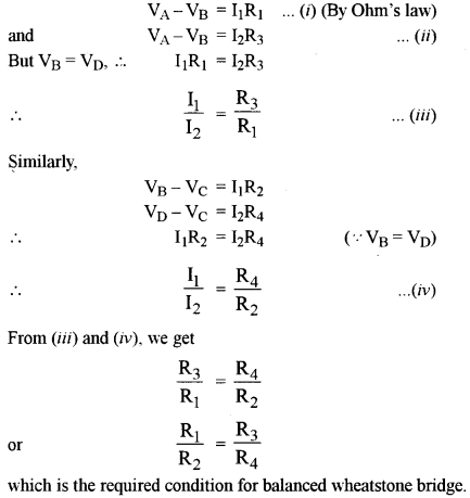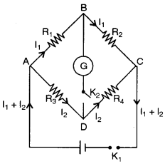 (b) In the figure is shown a labelled diagram of a balanced Wheatstone bridge, R1, R2, R3, R4 are the resistances in the four arms of the bridge. The bridge is said to be balanced, when no current flows when the key K1 is pressed first and then the key K2. The points B and D are at the same potential. In this case, the same current I1 flows through AB and BC and the current I2 flows through AD and DC.