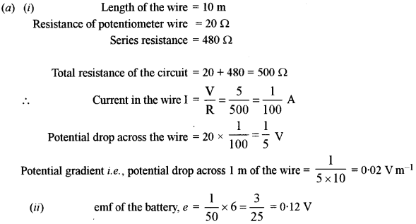 (a) A 10 m long uniform metallic wire having a resistance of 20 Ω is used as a potentiometer wire. This wire is connected in series with another resistance of 480 Ω and a battery of emf 5 V having negligible internal resistance. If an unknown emf e is balanced across 6 m of the potentiometer wire, calculate :