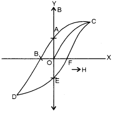 (b) (i) Hysteresis : Hysteresis curve represents the relation between magnetic flux density \(\overrightarrow{\mathrm{B}}\) and the intensity of magnetising field B. The shape of the curve is as shown when a speciment of a ferromagnetic substance is taken through a cycle of magnetisation. The graph is not a straight line. Clearly, B ≠ 0, when H = 0.