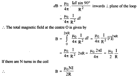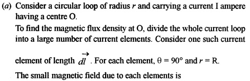 (a) Obtain an expression for magnetic flux density B at the center of a circular coil of radius R, having N turns and carrying a current I. [3]