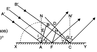 (a) In the figure is shown a wave front AB obliquely incident on a reflecting surface XY at any instant of time. According to Huygens s principle, every point on the incident wave front is a source of a secondary wavelets which travel with the speed of the incident waves. The position of the reflected wave front after a time t is CGD as shown in the fig. The angle of incidence i and of reflection r are as shown.