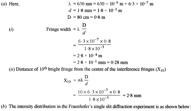 (a) Laser light of wavelength 630 nm is incident on a pair of slits which are separated by 1.8 mm. If the screen is kept 80 cm away from the two slits, calculate : [3]