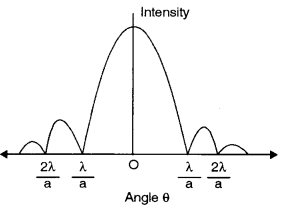 (b) Show graphically the intensity distribution in Fraunhofer’s single slit diffraction experiment. Label the axes. [2]