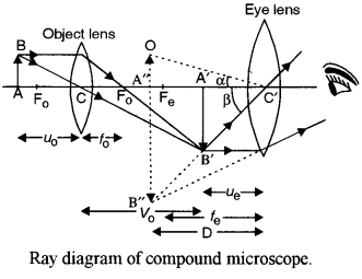 (a) Draw a labelled ray diagram of an image formed by a compound microscope, when the final image lies at the least distance of distinct vision (D). [3]