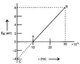 (a) In an experiment of photoelectric effect, the graph of maximum kinetic energy EK of the emitted photoelectrons versus the frequency v of the incident light is a straight line AB as shown in