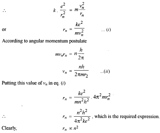 (a) Let the electrons of mass m be moving with a velocity vn in an orbit of radius r around the nucleus of hydrogen carrying a charge + e. Since the electrostatic force between the electron and proton supplies the necessary electrostatic force.