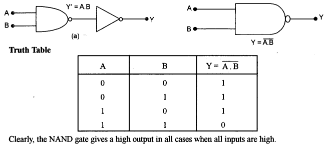 (b) NAND gate : It consists of a combination of AND gate and a NOT gate. The ‘NOT’ negates the output of a NAND gate. It is represented by \(Y=\overline{A . B}\).