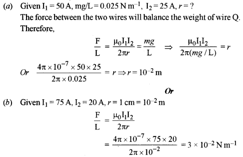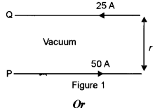(a) A long horizontal wire P carries a current of 50 A. It is rigidly fixed. Another wire Q is placed directly above and parallel to P as shown in Figure 1 below. The weight per unit length of the wire Q is 0.025 N m-m and it carries a current of 25 A. Find the distance r of the wire Q from the wire P so that the wire Q remains at rest.