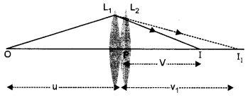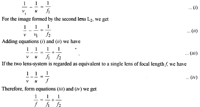 (b) Consider two lenses A and B of focal length f1 and f2 placed in contact with each other. Let the object be placed at a point O beyond the focus of the first lens L1 as shown.